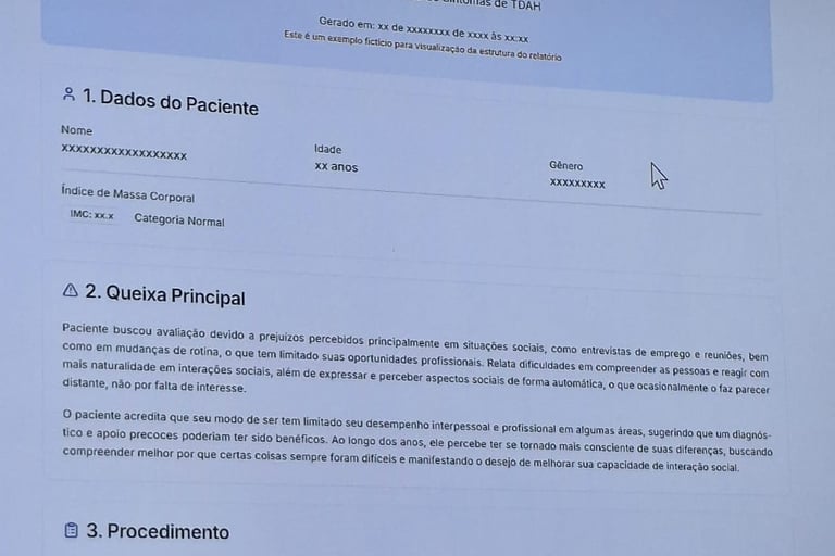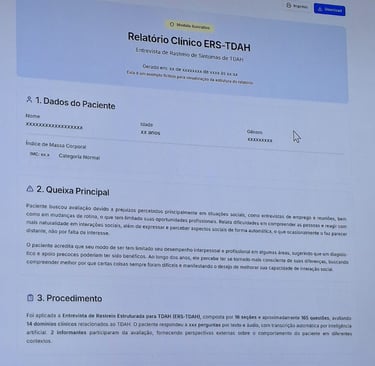 O relatório gerado já oferece hipóteses iniciais, recomendações personalizadas de acordo com os resultados coletados e indica se é necessário prosseguir para avaliação neuropsicológica completa, avaliação psiquiátrica ou outras intervenções.